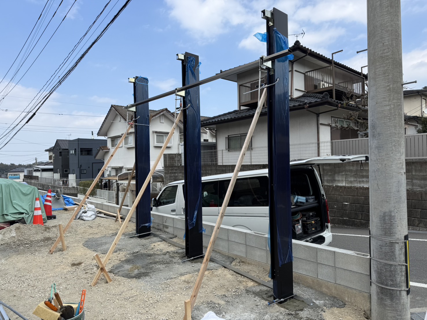 ブラックの角柱を建て込み、仮支えで垂直を確保しながら躯体を組み上げていきます。後方支持タイプのため、前面に柱が出ず開放的な空間が生まれます。